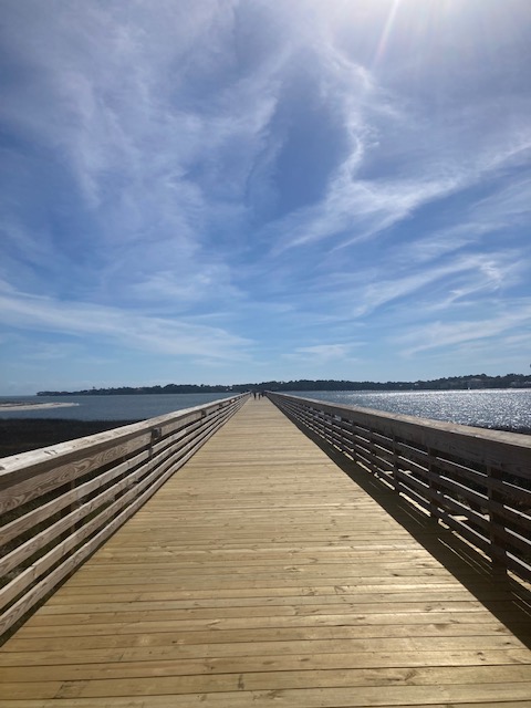 I went on a solid bike ride today, up the highway near the bridge to the bordering Fripp Island. Just before the bridge is one of the longest fishing piers in South Carolina. I talked to a guy fishing the pier who was trying to catch sheepshead. “You ever seen one?” he asked me. “They have teeth like humans.” And so they do, which made me really not want to catch one, although they’re evidently good eating. We talked a little and it turned out he was an avid outdoorsman, the hunting/fishing kind, and I’m pretty sure he knew more about fishing in Minnesota than I did. He said Pelican Lake in Minnesota is home to monster bluegills, and he’d been to Ely, MN, to fish and to hunt moose and possibly rabbit, I think he said, which can’t possibly be right, but he seemed a little off, so maybe.